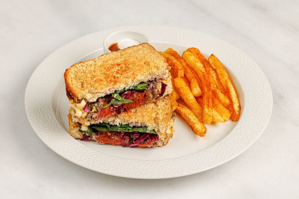 Sandwich parçalanmış ət və trufel mayonez ilə