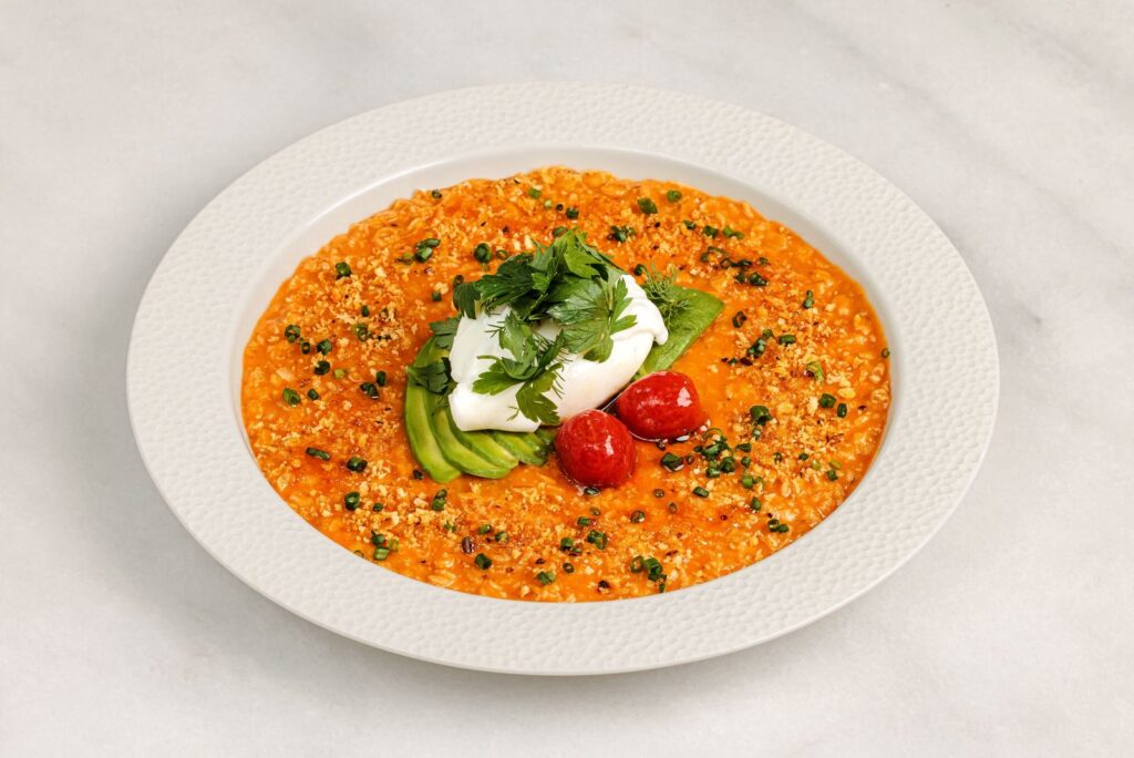 Oatmeal with tomatoes and poached egg
