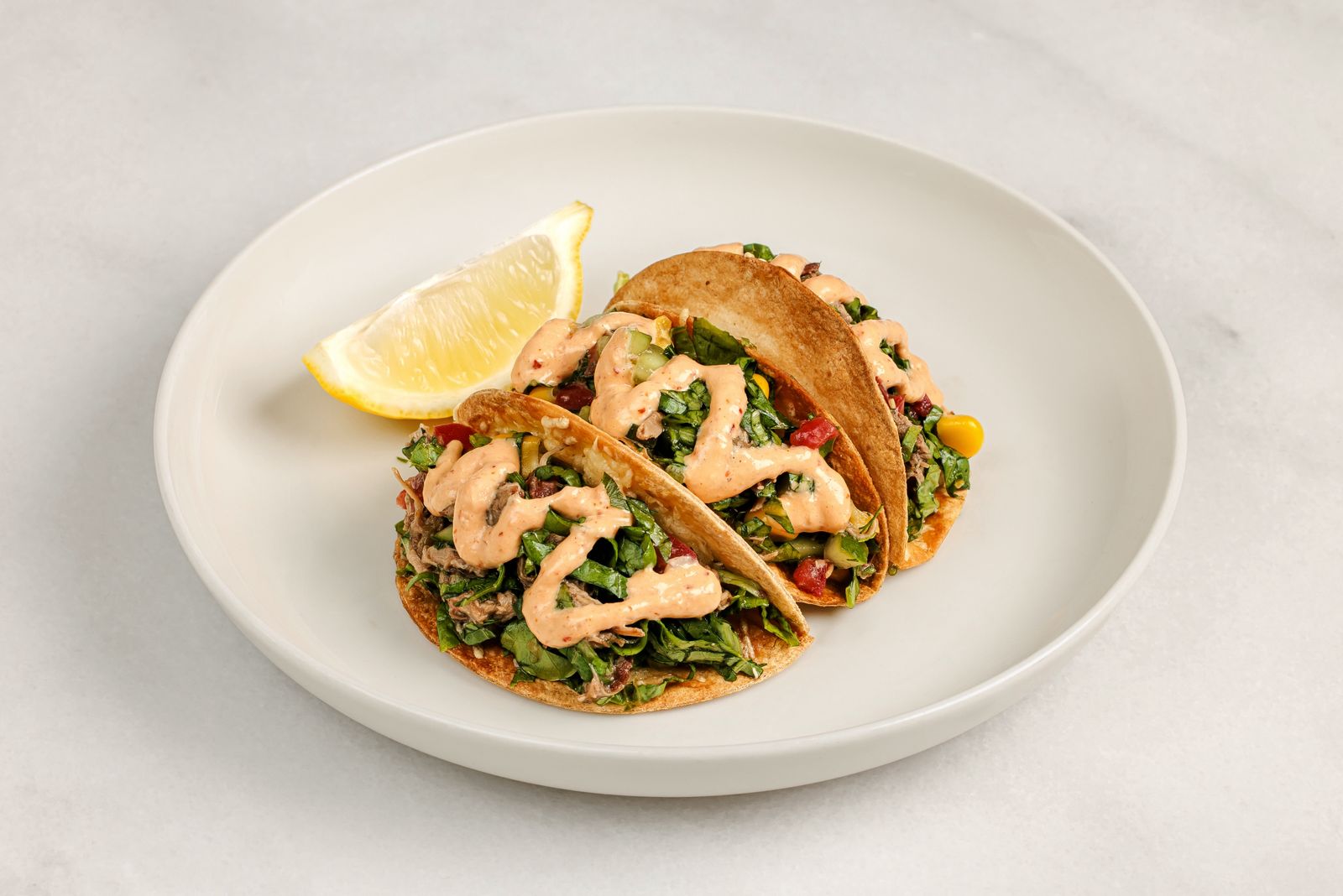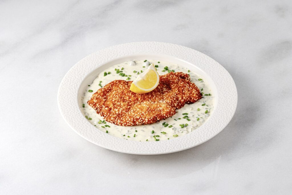 Зеленый салат с куриным шницелем и трюфельным майонезом